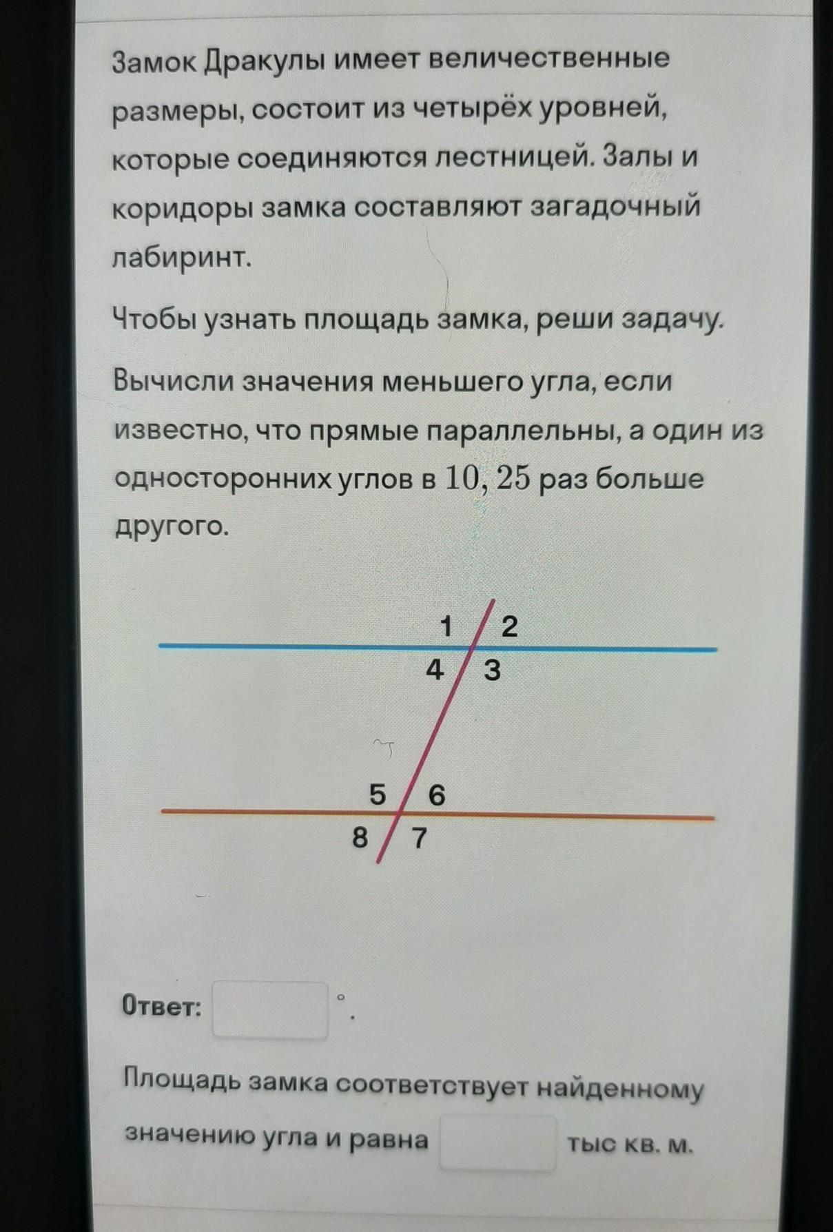 Пусть один из односторонних углов равен х, тогда второй из односторонних углов 10,25х. Составим и решим уравнение: