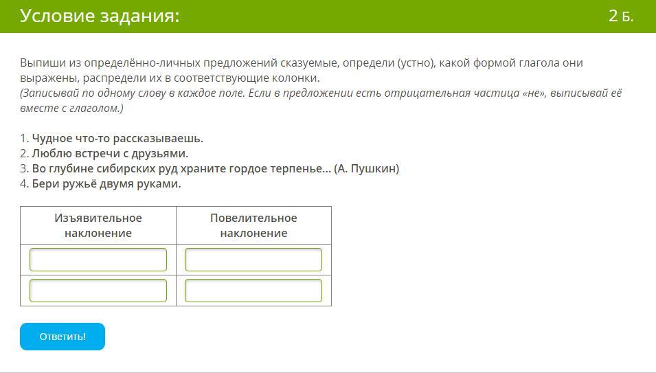 (Записывай по одному слову в каждое поле. Если в предложении есть отрицательная частица «не», выписывай её вместе с глаголом.)