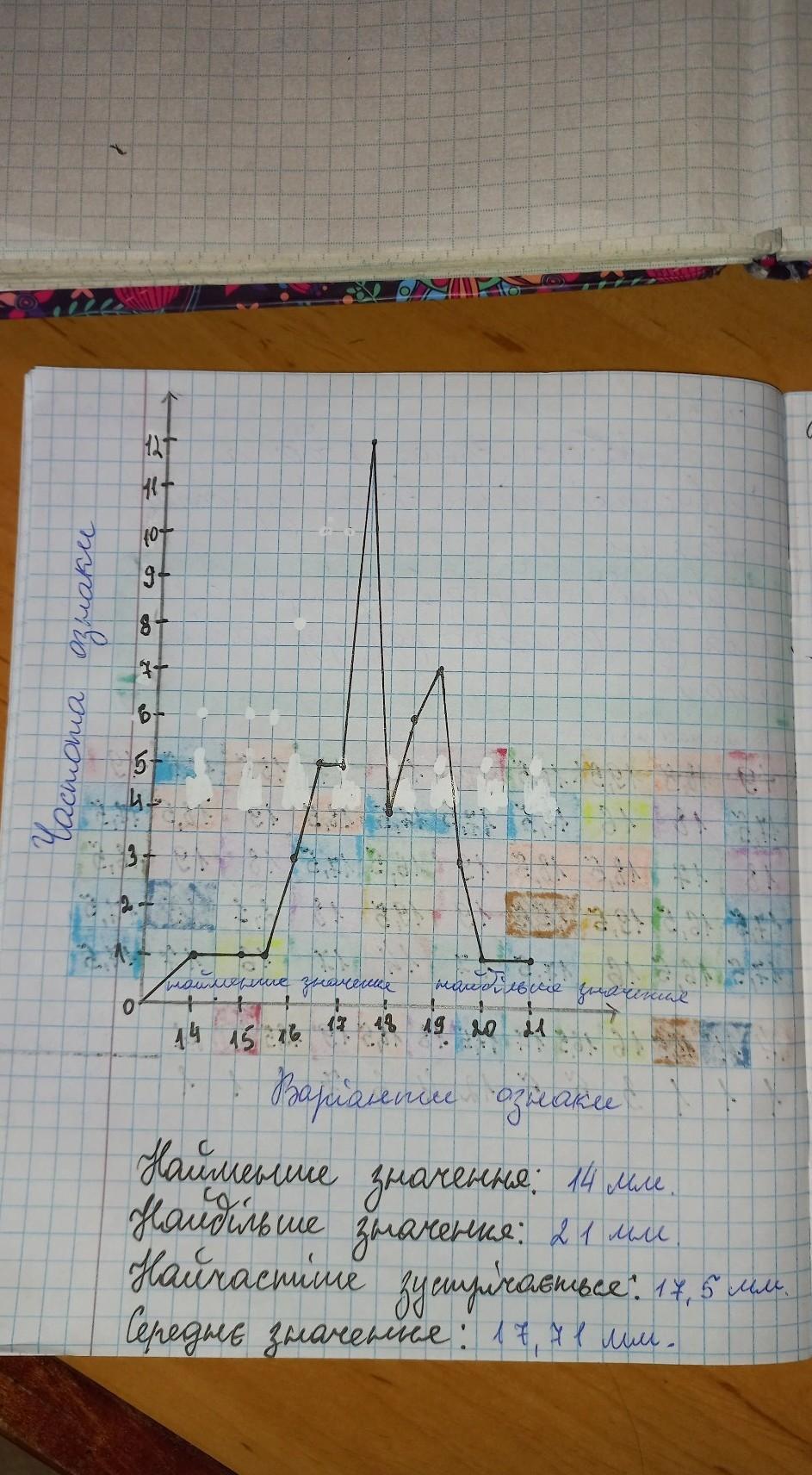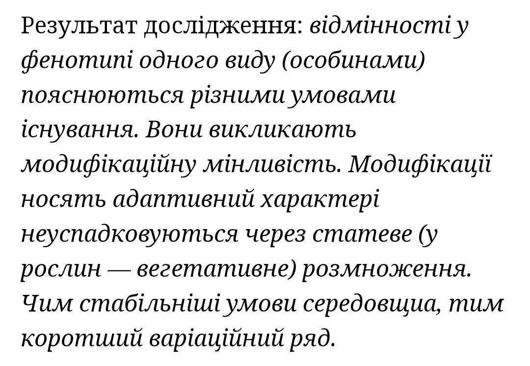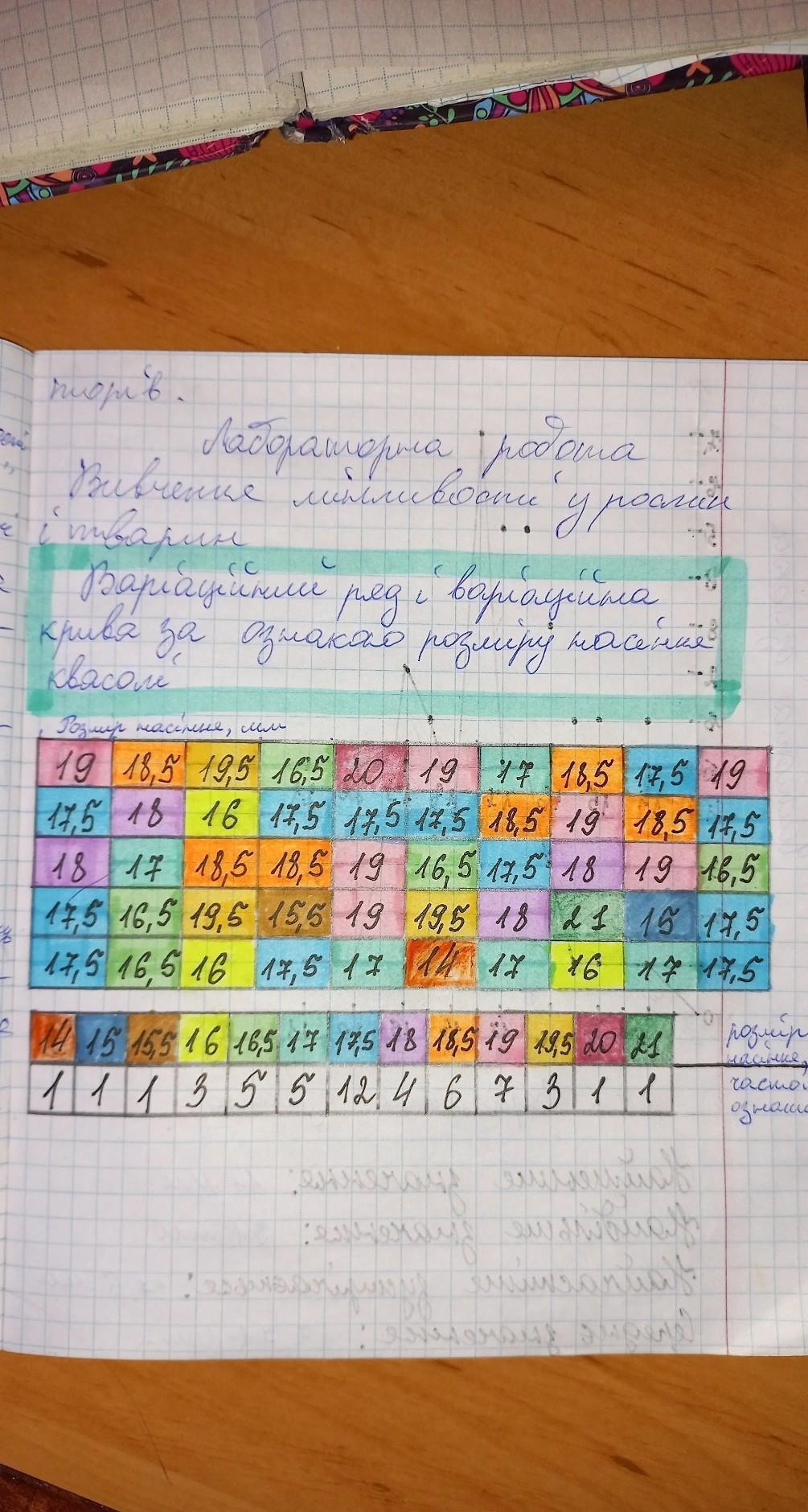 Лабораторне дослідження «ВИВЧЕННЯ МІНЛИВОСТІ У РОСЛИН І ТВАРИН» Мета: формуємо дослідницькі уміння визначати закономірності моди- фікаційної мінливості, будувати варіаційний ряд та варіаційну криву. Обладнання й матеріали: черепашки молюсків-серцевидок, боби ква- солі, насіння гарбуза тощо. Хід роботи 1. Оберіть ознаку для дослідження і визначте сукупність спостережень . кількісної ознаки, тобто вибірку. 2. Визначте діапазон мінливості ознаки, тобто норму реакції. 3. Визначте варіанти ознаки і частоту кожної з варіант ознаки. Резуль- тати запишіть до таблиці і складіть варіаційний ряд. 4. Побудуйте варіаційну криву. 5. Визначте середнє значення ознаки. 6. Підсумок роботи.