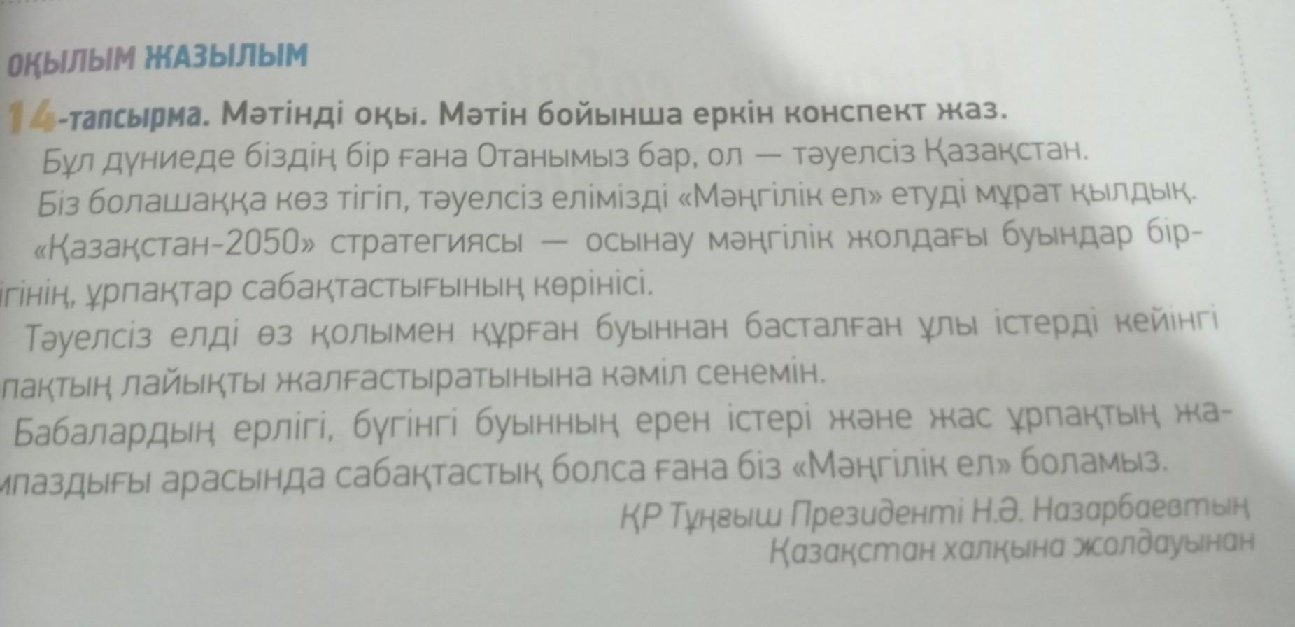 Біздің Отанымыз - тәуелсiз Қазақстан. Болашаққа көз тiгiп, елімізді "Мәңгiлiк ел" етуге мұрат қылдық. "Қазақстан -2050" стратегиясы, мәңгілік жолдағы буындар бірлігі мен ұрпақтар сабақтастығының көрiнiсi. Осы бастаманы кейінгі ұрпақтың жалғастыратынына кәміл сенемін. Бабаларымыздың ерлігі, қазіргі буынның ерен iстерi және жас ұрпақтың арасында сабақтастық болса, әрине "Мәңгілік ел" боламыз.