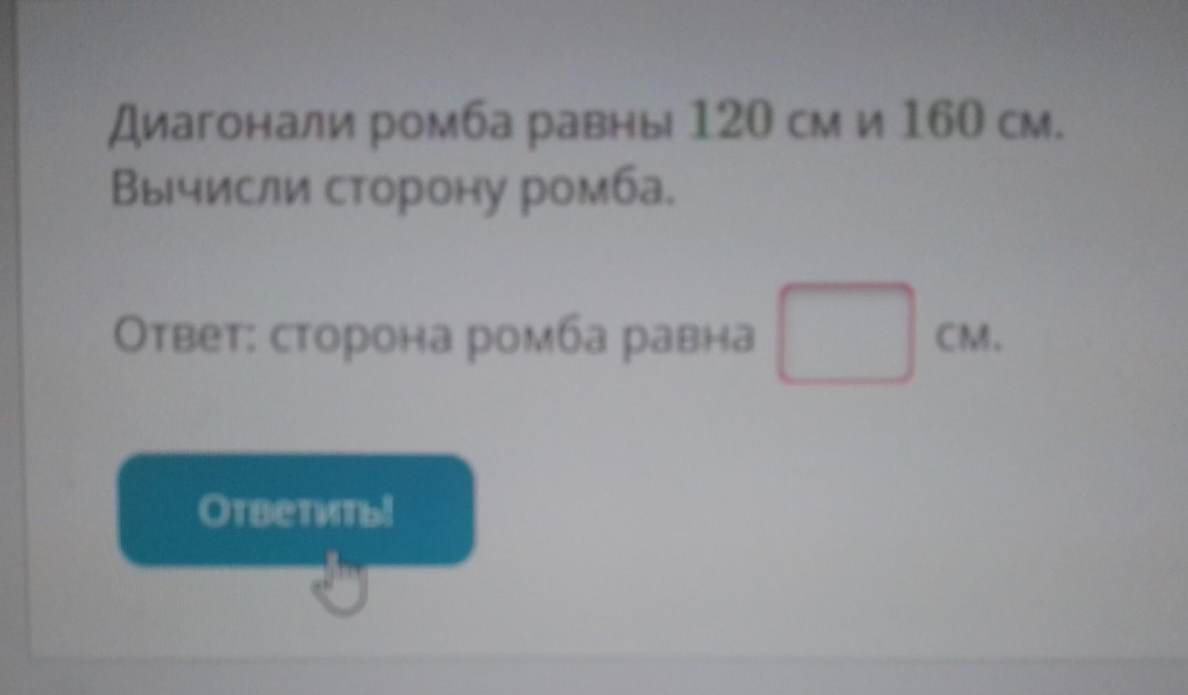 Диагонали ромба равны 120 см и 160 см. Вычисли сторону ромба. Ответ: сторона ромба равна ...