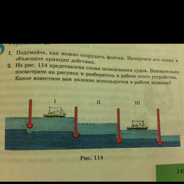 На рис. 114 представлена схема шлюзования судов. Внимательно посмотрите на рисунок и разберитесь в работе этого устройства. Какое известное вам явление используется в работе шлюзов?