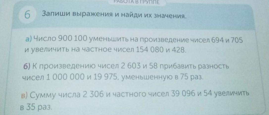 6 Запиши выражения и найди их значения. а) Число 900 100 уменьшить на произведение чисел 694 и 705 и увеличить на частное чисел 154 080 и 428. 6) К произведению чисел 2 603 и 58 прибавить разность чисел 1 000 000 и 19 975, уменьшенную в 75 раз. в) Сумму числа 2 306 и частного чисел 39 096 и 54 увеличить в 35 раз. Пожалуйста помогите я не понимаю, пожалуйста, все 3 нам задали