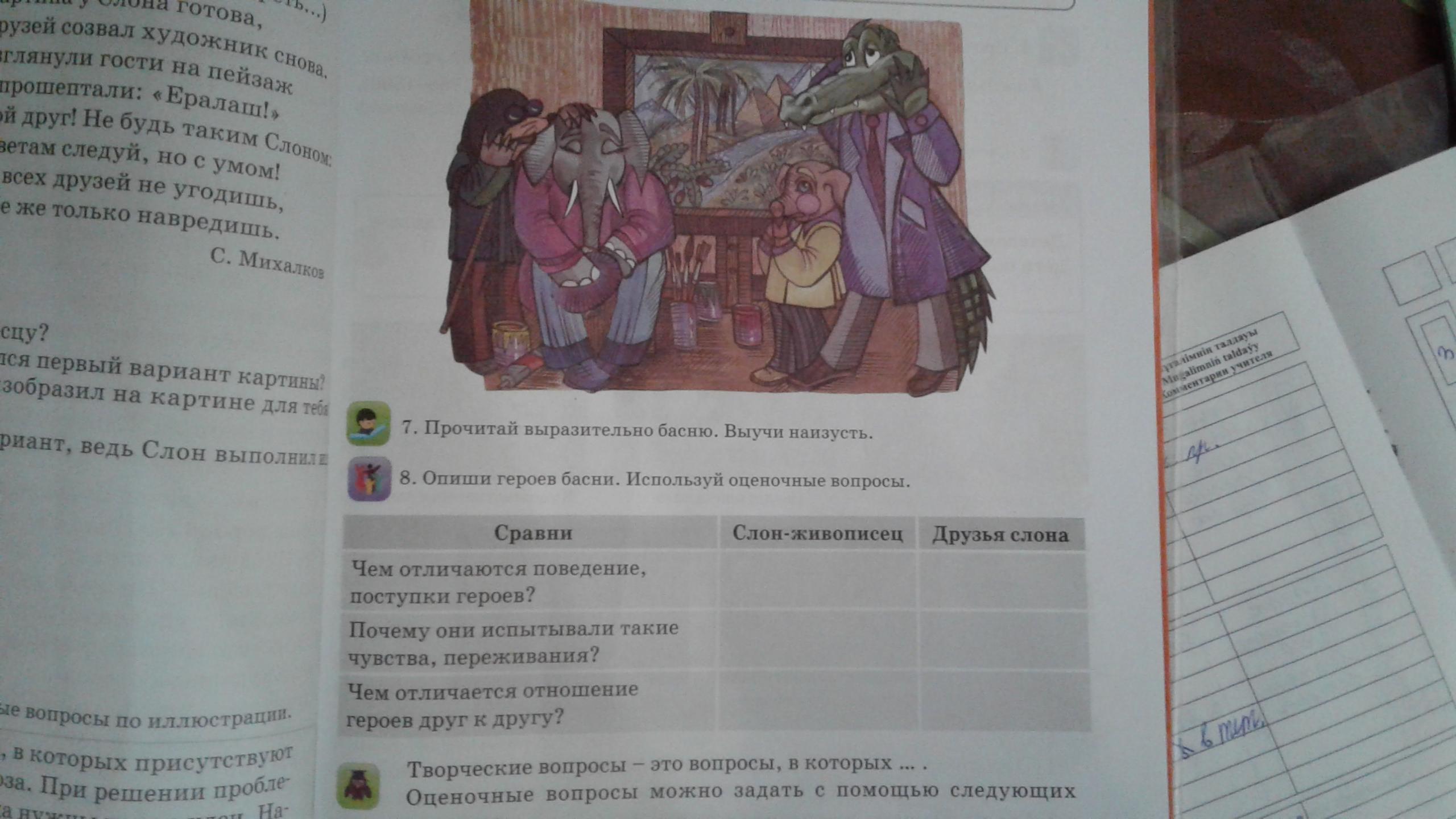 1 вопрос: Слон-живописец: рисовал картину. Друзья слона: оценили, дали советы.
