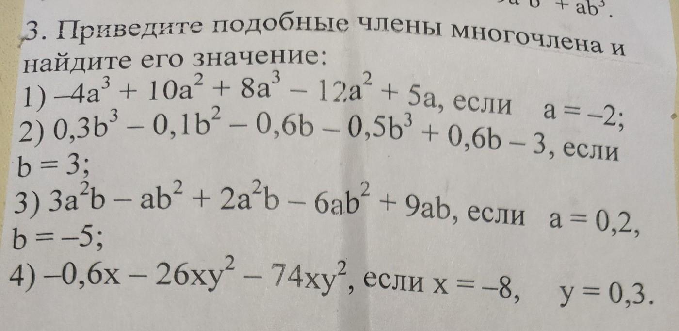 3) 3ab – ab° + 2ab – баb° + 9ab, если a = 0,2, b = -5; 4) -0,6х – 26xy? - 74xу, если х=-8, y= 0,3. 2 3