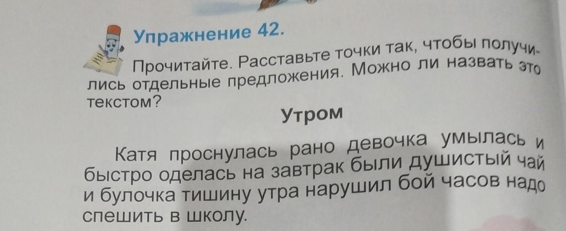 Катя проснулась рано. Девочка умылась и быстро оделась. На завтрак были душистый чай и булочка. Тишину утра нарушил бой часов. Надо спешить в школу.