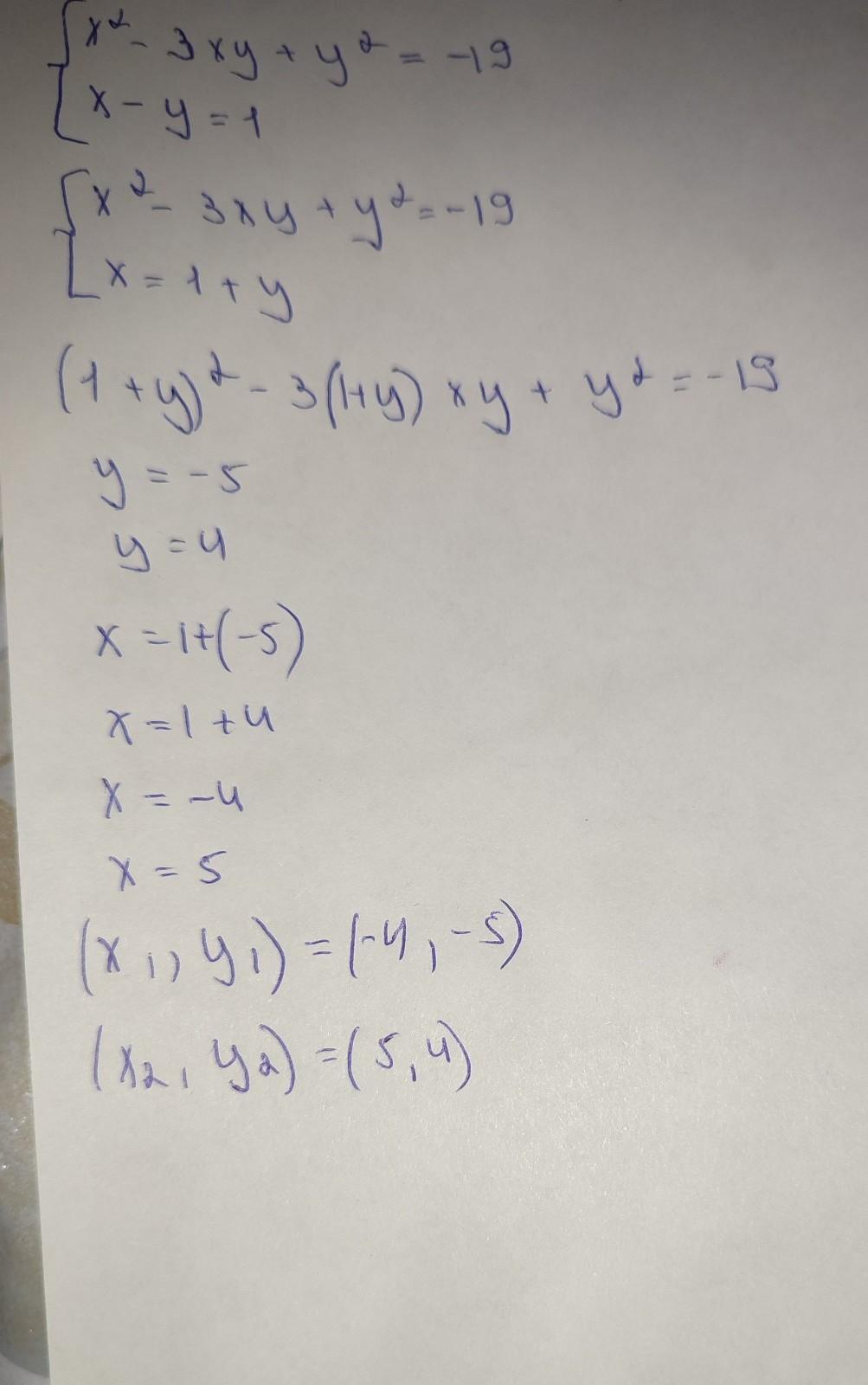 Подставляем x = 1+y в уравнение x^2-3xy+y^2=-19