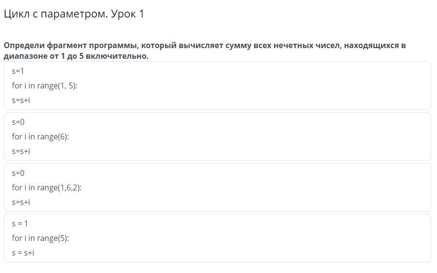 Определи фрагмент программы, который вычисляет сумму всех нечетных чисел, находящихся в