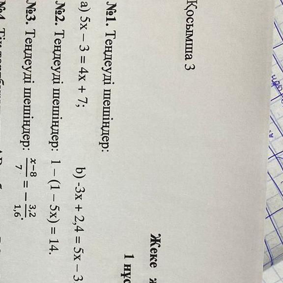 1)a)5x - 3 = 4x + 7 \\ 5x - 4x = 7 + 3 \\ x = 10 \\ b) - 3x + 2.4 = 5x - 3 \\  - 3x - 5x =  - 3 - 2.4 \\  - 8x =  - 5.4 \\  8x = 5.4 \\ x = 0.675 \\ 2)1 - (1 - 5x) = 14 \\ 1 - 1 + 5x = 14 \\ 5x = 14 \\ x =  \frac{14}{5}  \\ x = 2.8 \\ 3) \frac{x - 8}{7}  =   - \frac{3.2}{1.6}  \\  \frac{x - 8}{7}  =  - 2 \\ x - 8 =  - 14 \\ x =  - 14 + 8 \\ x =  - 6