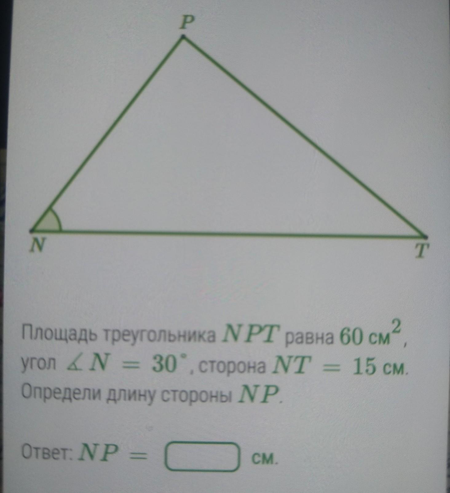 маємо площу і одну сторону, запишемо так:S=1/2*NT*h (висота проведена з точки Р до прямої NT