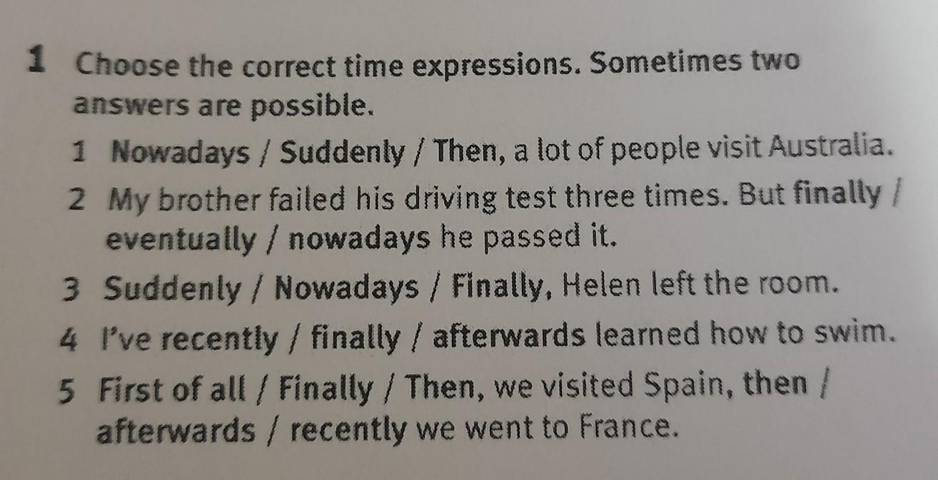 1 Nowadays / Suddenly / Then, a lot of people visit Australia. 2 My brother failed his driving test three times. But finally i eventually / nowadays he passed it. 3 Suddenly / Nowadays / Finally, Helen left the room. 4 I've recently / finally / afterwards learned how to swim. 5 First of all / Finally / Then, we visited Spain, then / afterwards / recently we went to France.