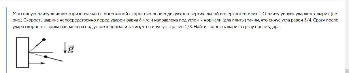 Массивную плиту двигают горизонтально с постоянной скоростью перпендикулярно вертикальной поверхности плиты. О плиту упруго ударяется шарик (см. рис.) Скорость шарика непосредственно перед ударом равна 8 м/с и направлена под углом к нормали (для плиты) таким, что синус угла равен 3/4. Сразу после удара скорость шарика направлена под углом к нормали таким, что синус угла равен 1/3. Найти скорость шарика сразу после удара.