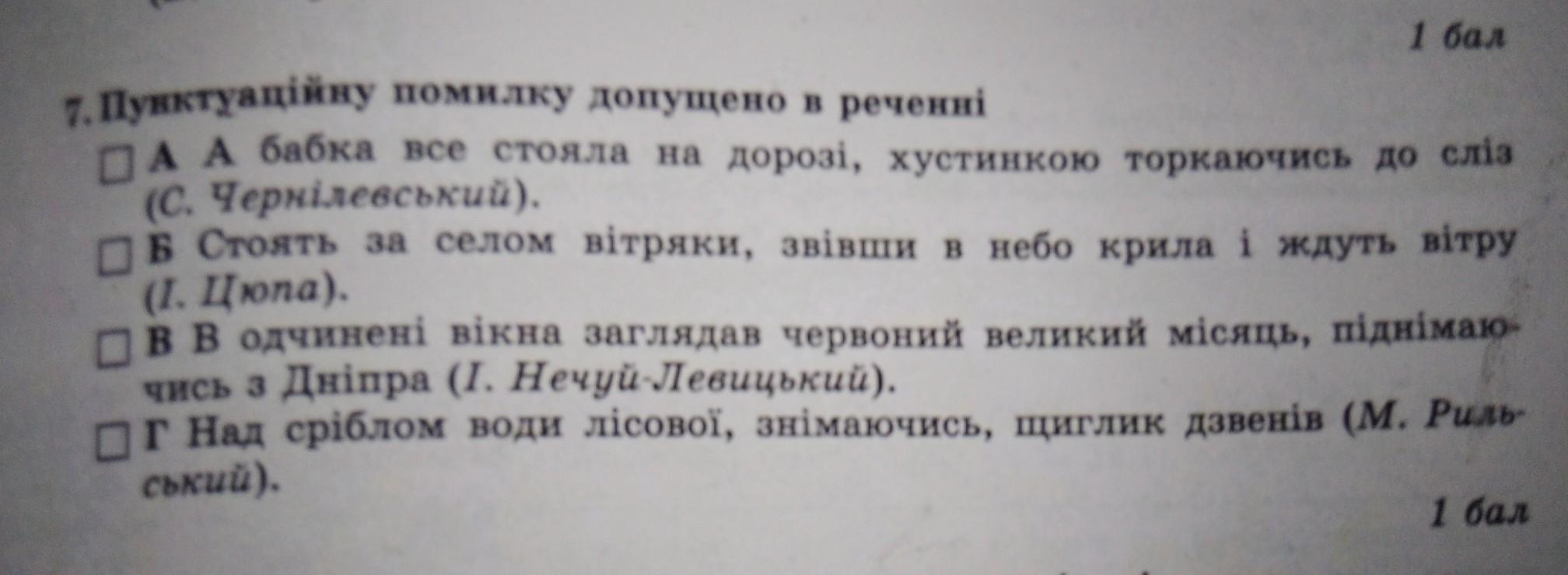 7. Пунктуаційну помилку допущено в реченні ПА А бабка все стояла на дорозі, хустинкою торкаючись до сліз (с. Чернілевський). ОБ Стоять за селом вітряки, звівши в небо крила і ждуть вітру (І. Цюпа). вводчинені вікна заглядав червоний великий місяць, піднімаю- чись з Дніпра (І. Нечуй-Левицький). ог Над сріблом води лісової, знімаючись, щиглик дзвенів (М. Риль ський). 1 бал