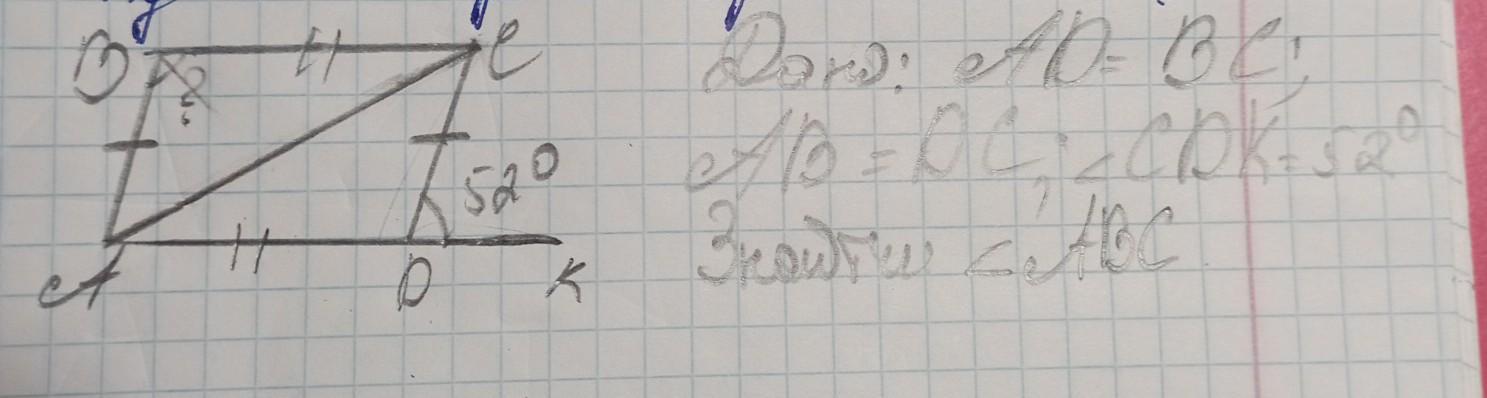 2) у трикутникаx ABC i CDA, AD = BC, AB = DC , CDK=52° (Знайдiть ABC)