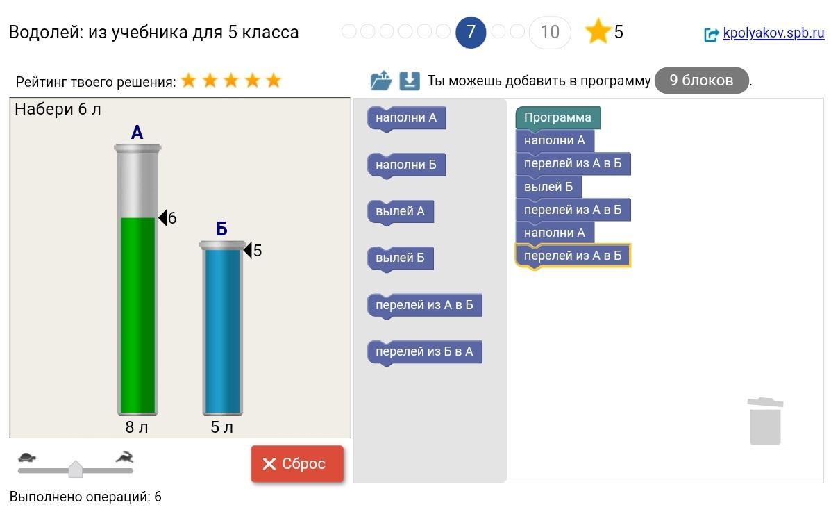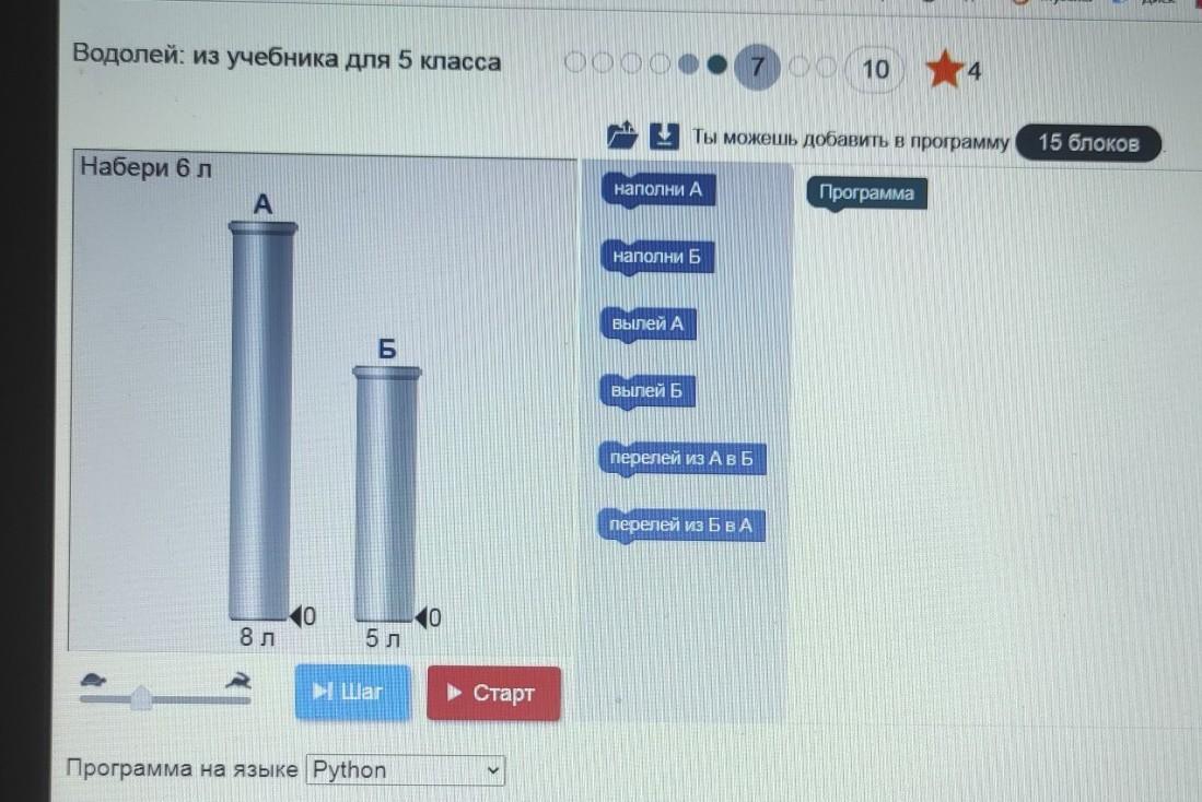Водолей: из учебника для 5 класса Оооо 5 010 4 Ты можешь добавить в программу 5 блоков Набери 1 л наполни А Б наполни Б Программа наполни А перелей из ABБ наполни А перелей из А в Б Вылей Б Вылей А A Вылей Б перелей из А в Б перелей из БВА (2 0 6 л 10 л X сброс Выполнено операций. 5 Программа на языке Python 1 fillAO 2 frоmAtoBO 3 fillAO 4 fromAtoBO omnti