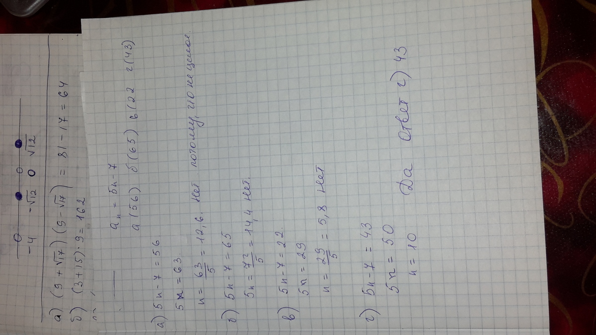 Арифметическая прогрессия (An)задана формулой An=5n-7,Какое число из следущих является членом этой прогресии а (56) б(65) в(22) г(43)Укажите решение(обязательно)!!!!!!!!!