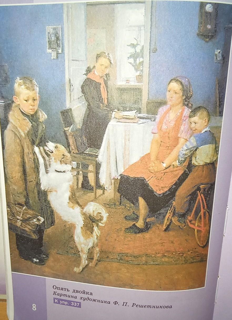 На картине мы видим семью,которая встречает мальчика со школы с плохой отметкой.Мальчик-двоечник одет в брюки и в чёрные ботинки.В правой руке он держит перевязанный рюкзак,в котором лежат коньки.У мальчика очень грустное лицо с оттопыренными ушами,также у него светлые волосы.На картина видно,у него грустное настроение.Рядом с мальчиком прыгает его собака. В стороне сидит его мама.Поза мамы расстроенная,растерянная.У неё опустились руки от такой вести. Рядом с мамой сидит младший брат на велосипеде.Он ждёт,когда можно будет поиграть с ним. За кухонным столом сидит и учит уроки сестра.Ее отношение к брату-двоечнику строгое,ей больше жаль свою мамочку,чем брата.