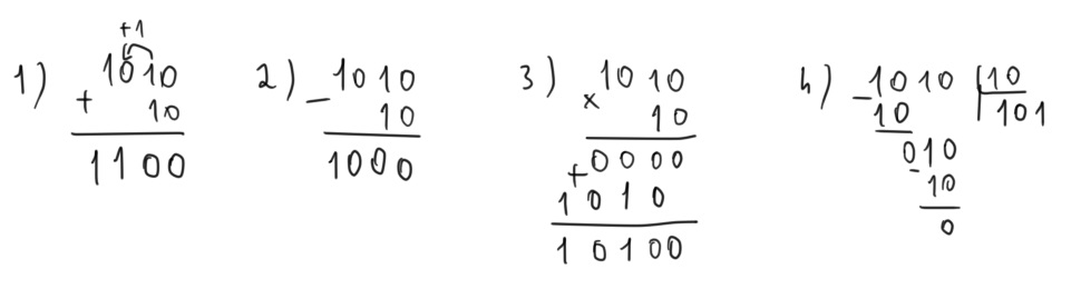 Провести сложение, вычитание, умножение и деление двоичных чисел 1010₂ и 10₂