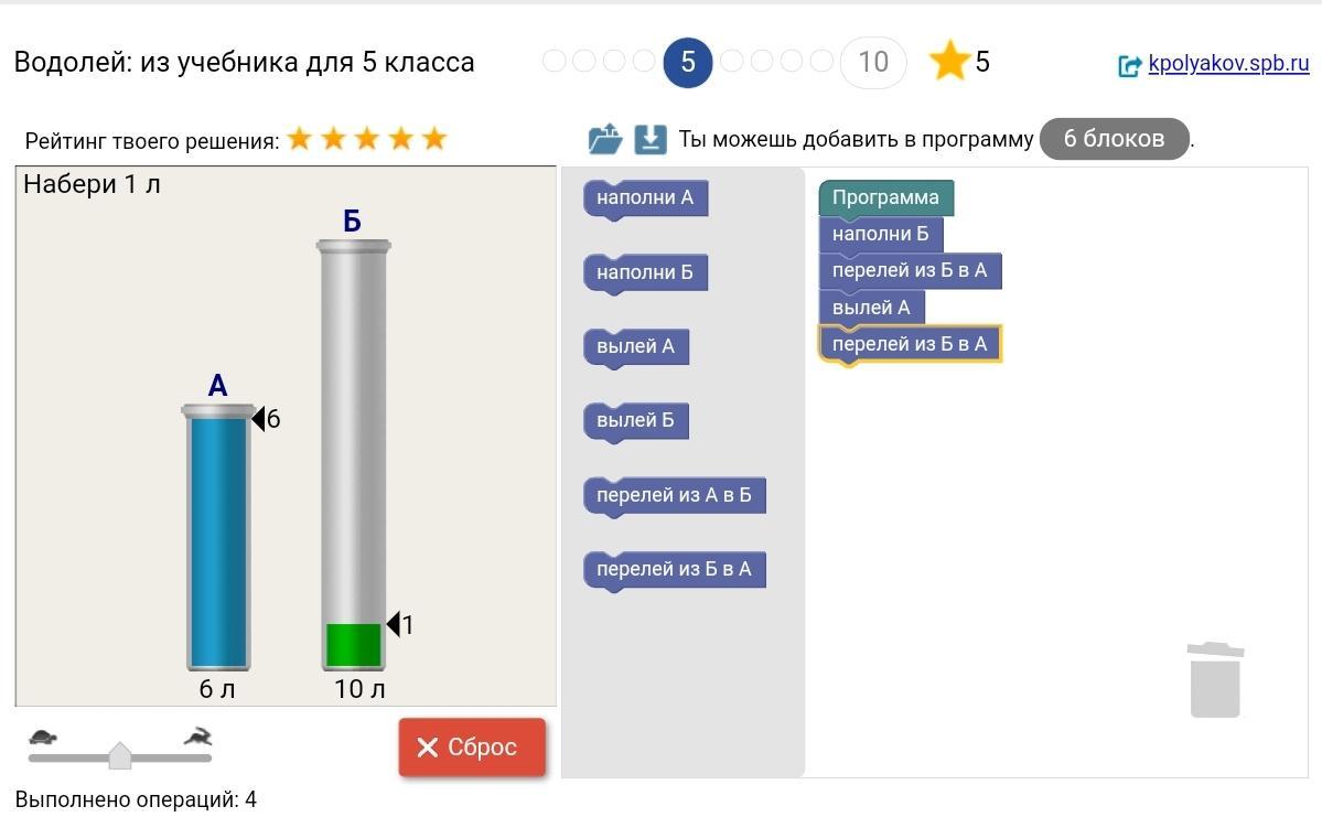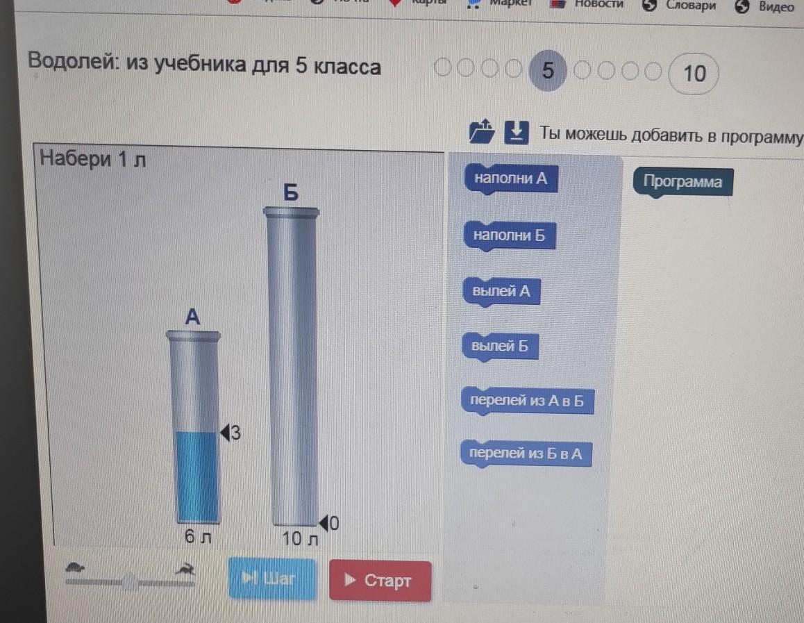 Водолей: из учебника для 5 класса 5 en 10 би ты можешь добавить в программу 106 Набери 1 л наполни А Программа ОЛ Б ΗΠΑΠΙΓΙΠΗ Ε вылей А A ВЫПей в Перепей из ABE 3 nepener V3 DBA 6 л 10 10 л Шаг Старт