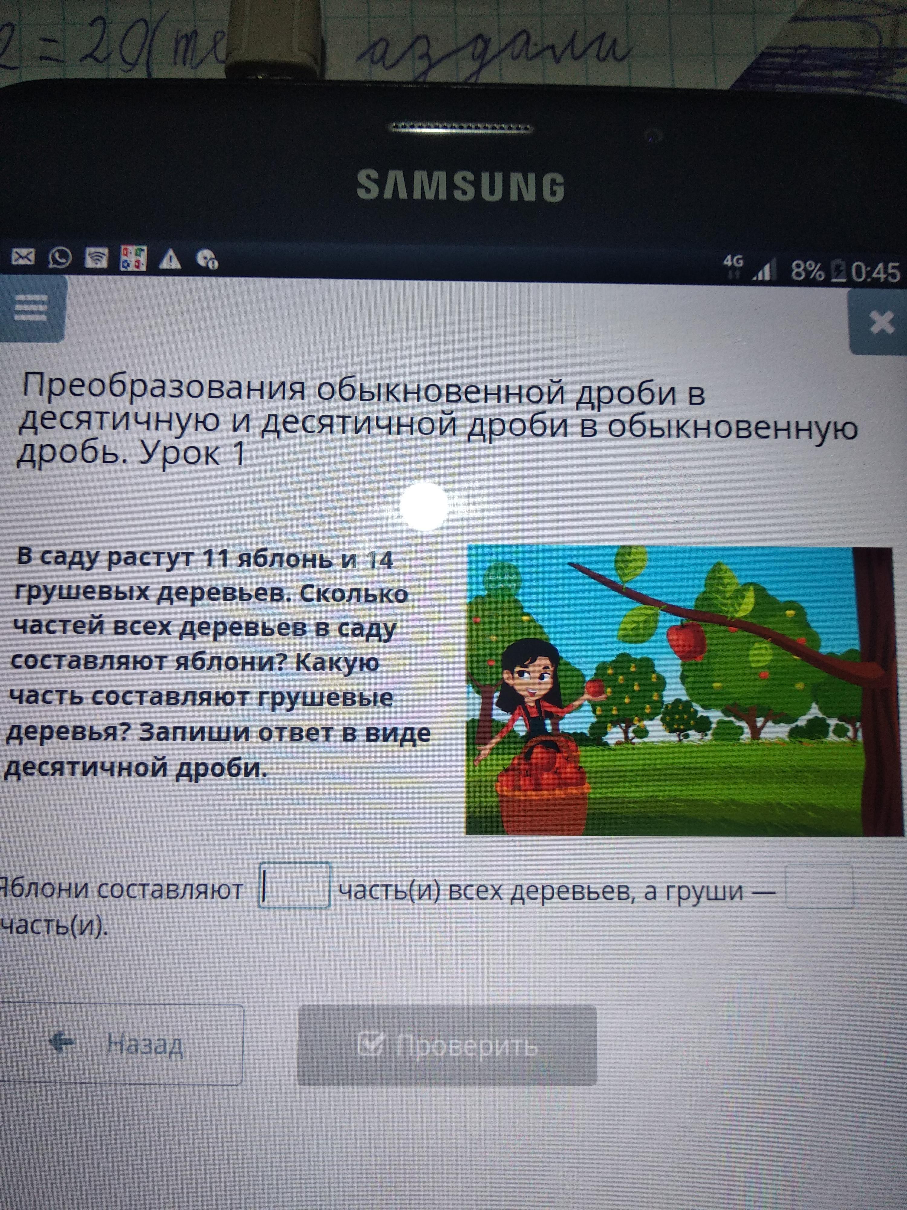 Всего деревьев 25(11+14). Значит яблони составляют 11/25(0,44) , а груш 14/25(0,56)