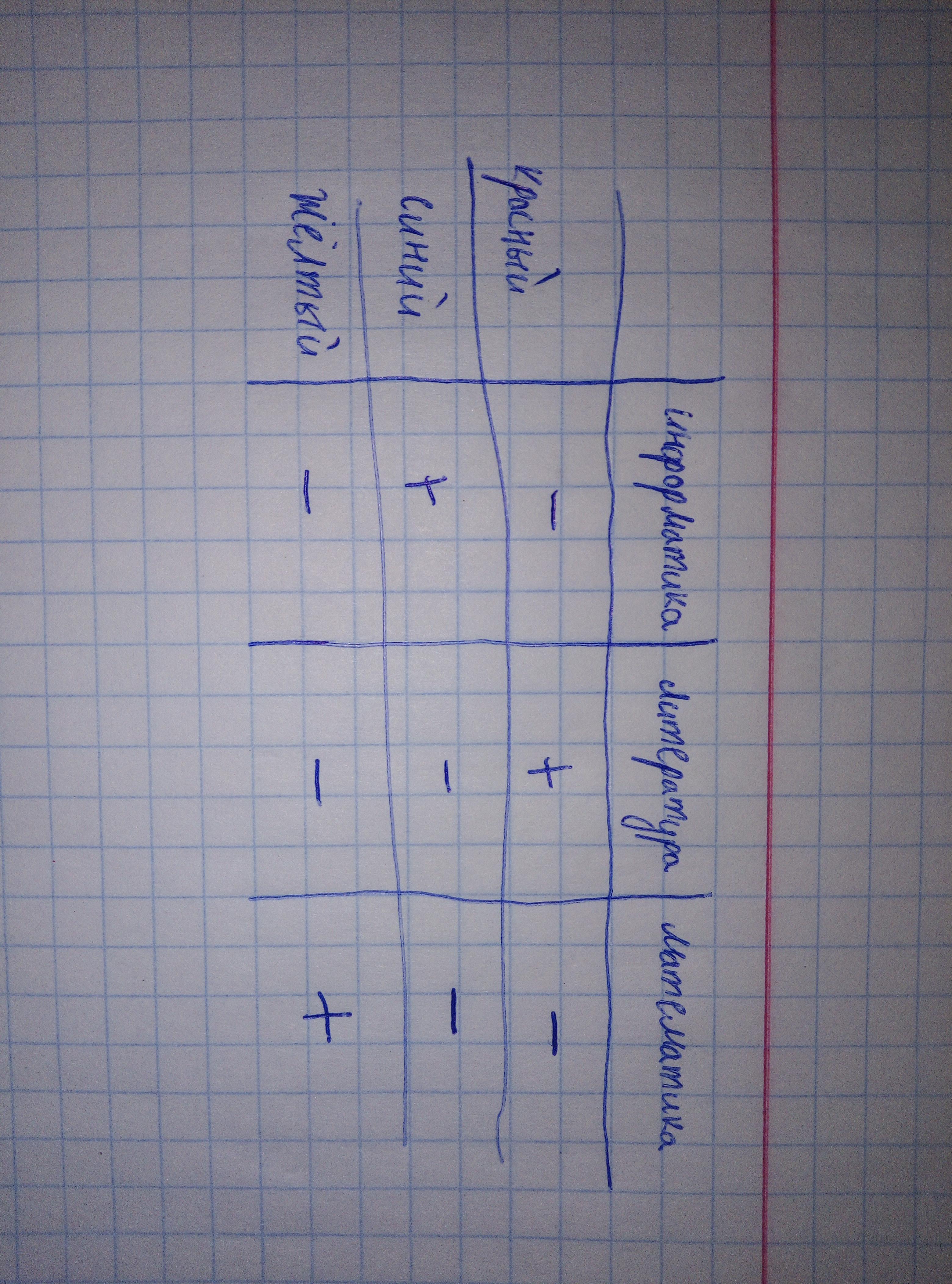 На полке стоит три учебника: по математике, по информатике и по литературе. Все они разных цветов - синего, желтого и красного. Посередине стоит книга красного цвета. Слева от учебника по литературе стоит учебник синего цвета. Учебник по математике стоит правее остальных книг. Определите, какой учебник, какого цвета, заполнив таблицу.