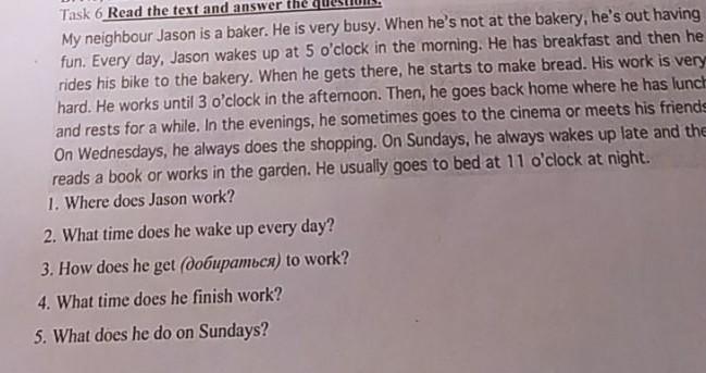Джейсон встаёт в 5:00 утра Джейсон работает в пекарне Джейсон добирается на работу на велосипеде Джейсон заканчивает работать в 3:00 дня Джейсон встаёт поздно по воскресеньям и читает книги или работают в садусаду