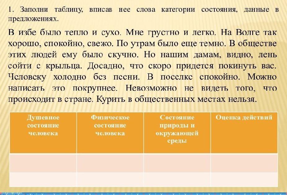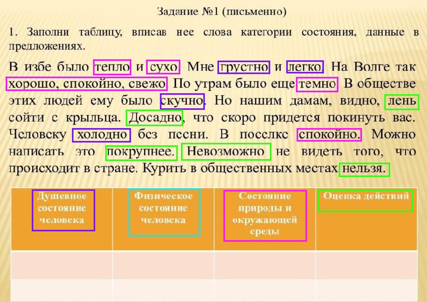 Мне кажется, что тут нет ни одного наречия, относящегося к описанию физического состояния человека (возможно, можно отнести "холодно, но это больше метафора"). Выделила цветами