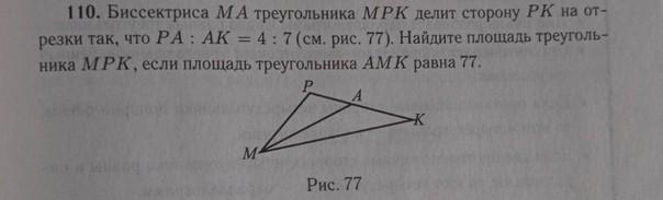 110. Биссектриса МА треугольника МРК делит сторону РК на отрезки так, что РА : AK = 4 : 7 (см. рис. 77). Найдите площадь треугольника МРК, если площадь треугольника АМК равна 77.