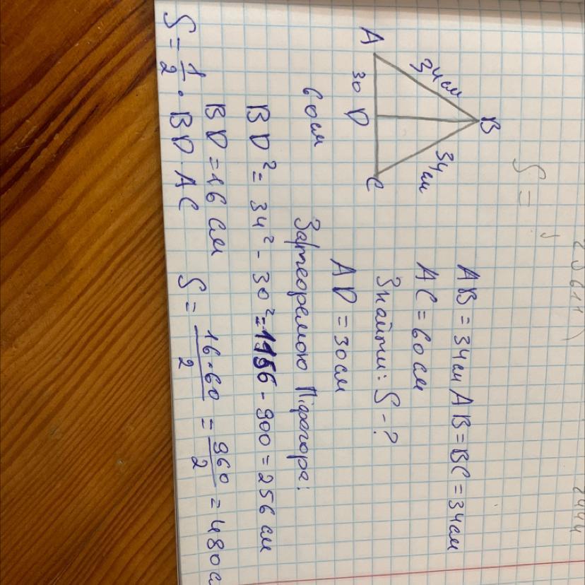 Боковая сторона равнобедренного треугольника равна 34 см а основание 60 Найдите площадь треугольника.