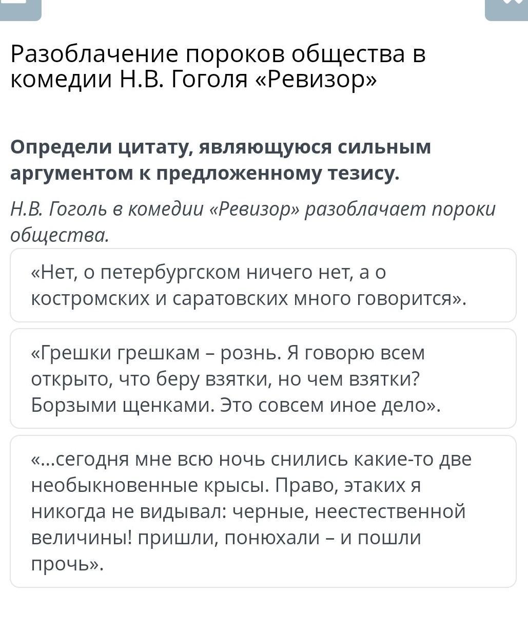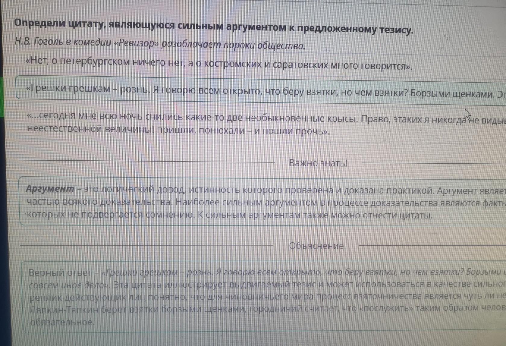 аргументом к предложенному тезису. Н.В. Гоголь в комедии «Ревизор» разоблачаем пороки общества.