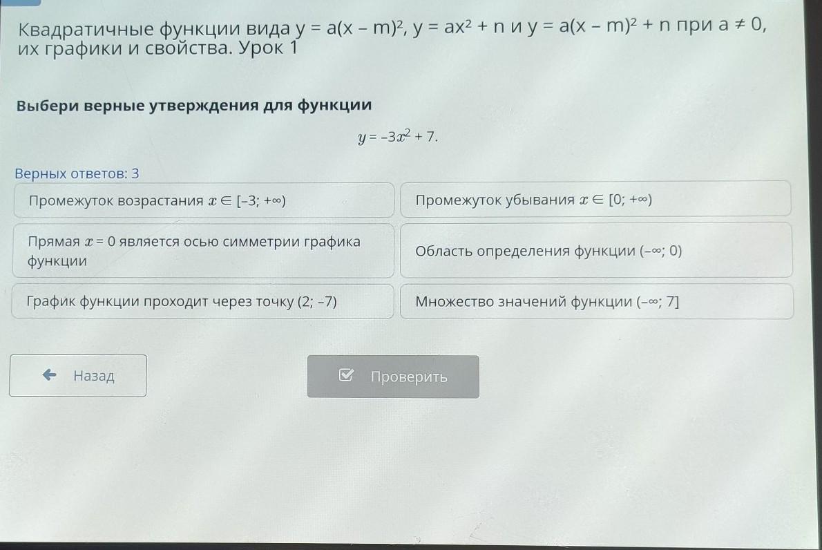 Выбери верные утверждения для функции y=-3x2 + 7. Верных ответов: 3 Промежуток возрастания хЄ [-3; +0) Промежуток убывания те [0; +oo) Прямая х = 0 является осью симметрии графика функции Область определения функции (-ю; 0) График функции проходит через точку (2; -7) Множество значений функции (-ю; 7]