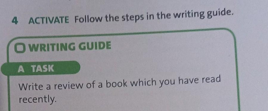 4 ACTIVATE Follow the steps in the writing guide. O WRITING GUIDE A TASK Write a review of a book which you have read recently