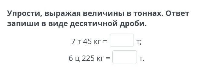 Упрости, выражая величины в тоннах. Ответ запиши в виде десятичной дроби. 7 т 45 кг =т; 6 ц 225 кг =т.
