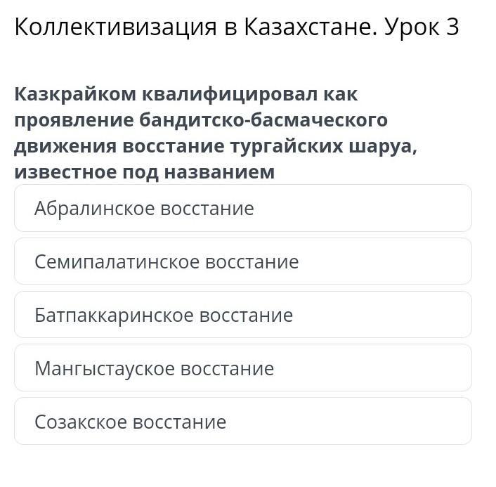 4)кооперивание-объединение, колхоз-коллективное хозяйство, 5)Кустанайский круг- Бекеданов, Кадиев, Семереченский округ Жанбаев и Сатырбаев 6)верно, неверно, верно 7)1.первые недовольства 2.Батпаккаринском 3. Мирзоян 8)Караев и Айменов, 9)1.27 марта, 2.Аксу, 3.потерпели поражение