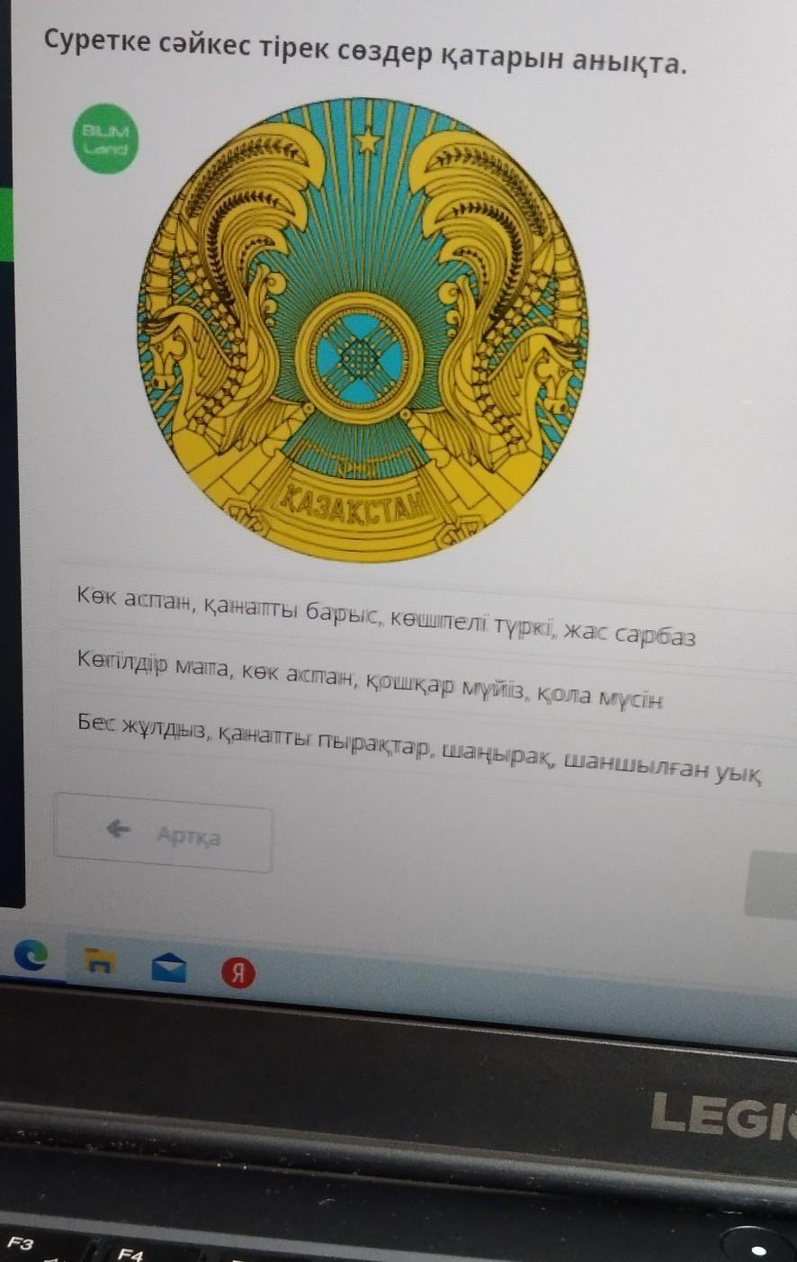 Суретке сәйкес тірек сөздер қатарын анықта. КАЗАКСТА. Көк аспан, қанатты барыс, көшпелі түркі, жас сарбаз Көгілдір мата, көк аспан, қошқар мүйіз, қола мүсін Бес жұлдыз, қанатты пырақтар, шаңырақ, шаншылған уық - Артқа Тексеру помогите срочно