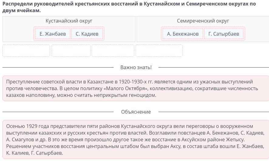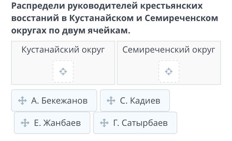 Распредели руководителей крестьянских восстаний в Кустанайском и Семиреченском округах по двум ячейкам.