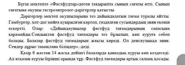 Сұрақтарға жауап бер. 1. Мектепте не өтті? 2. Сынып сағаты қандай тақырыпта өтті? _______________ 3. Оған кімдер қатысты? 4. Дәрігерлер оқушыларға не туралы айтты? Текст на фото
