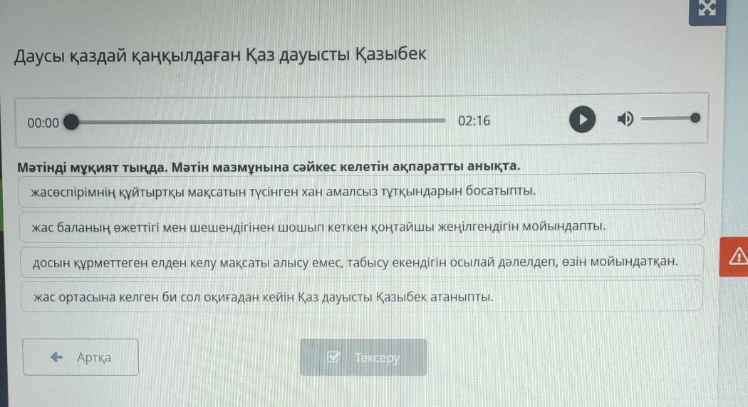 Даусы қаздай қаңқылдаған Қаз дауысты Қазыбек 00:00 02:16 Мәтінді мұқият тыңда. Мәтін мазмұнына сәйкес келетін ақпаратты анықта. жасөспірімнің құйтыртқы мақсатын түсінген хан амалсыз тұтқындарын босатыпты. жас баланың өжеттігі мен шешендігінен шошып кеткен қоңтайшы жеңілгендігін мойындапты. досын құрметтеген елден келу мақсаты алысу емес, табысу екендігін осылай дәлелдеп, өзін мойындатқан. жас ортасына келген би сол оқиғадан кейін Қаз дауысты Қазыбек атаныпты.