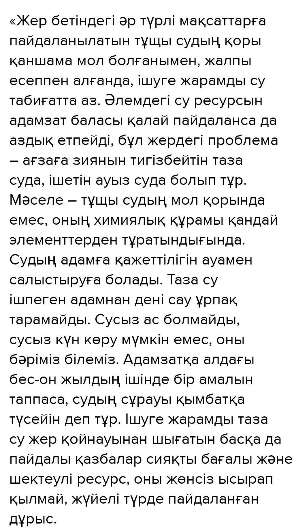 «Казакстанда ауызсу мәселесі шешілген» деген тақырыпта ке- лісу-келіспеу себептеріңді көрсетіп, эссе жазыңдар.
