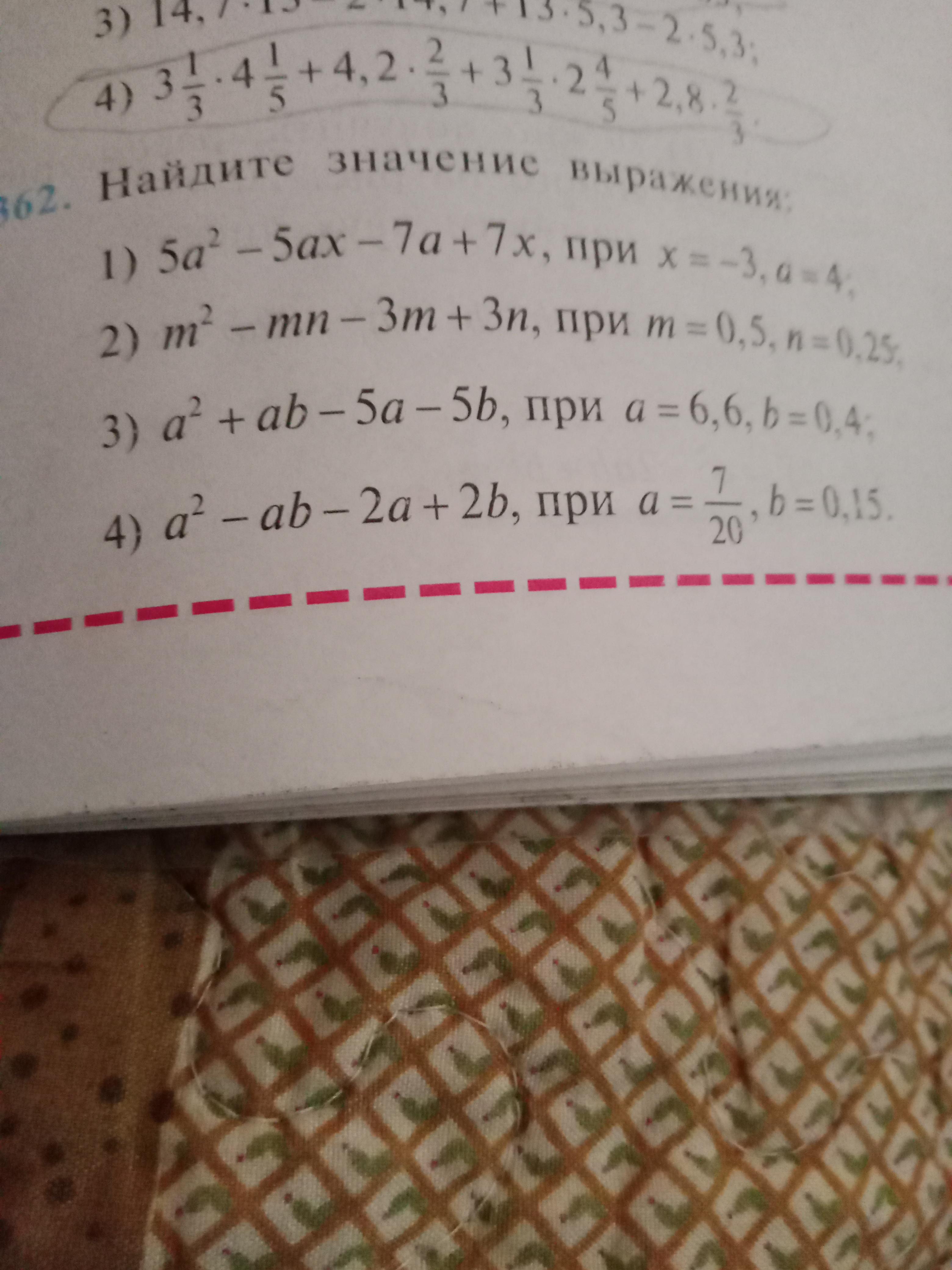 a² - ab - 2a + 2b = а * (а - b) - 2 * ( (а - b) = (а - b) * (а - 2). Если a = 7/20, b = 0,15 то (а - b) * (а - 2) = (7/20 - 1,15) * (7/20 - 2) = (0,35 - 0,15) * (0,35 - 2) = 0,2 * (-1,65) = -0,33.