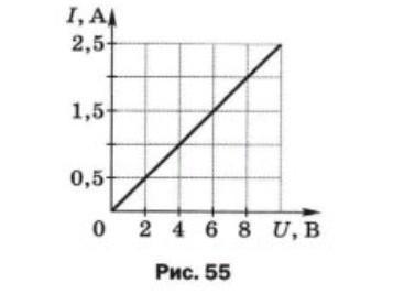 4. Определите по графику зависимости силы тока от напряжения (рис. 55), какова сила тока в проводнике при напряжении 6 В.