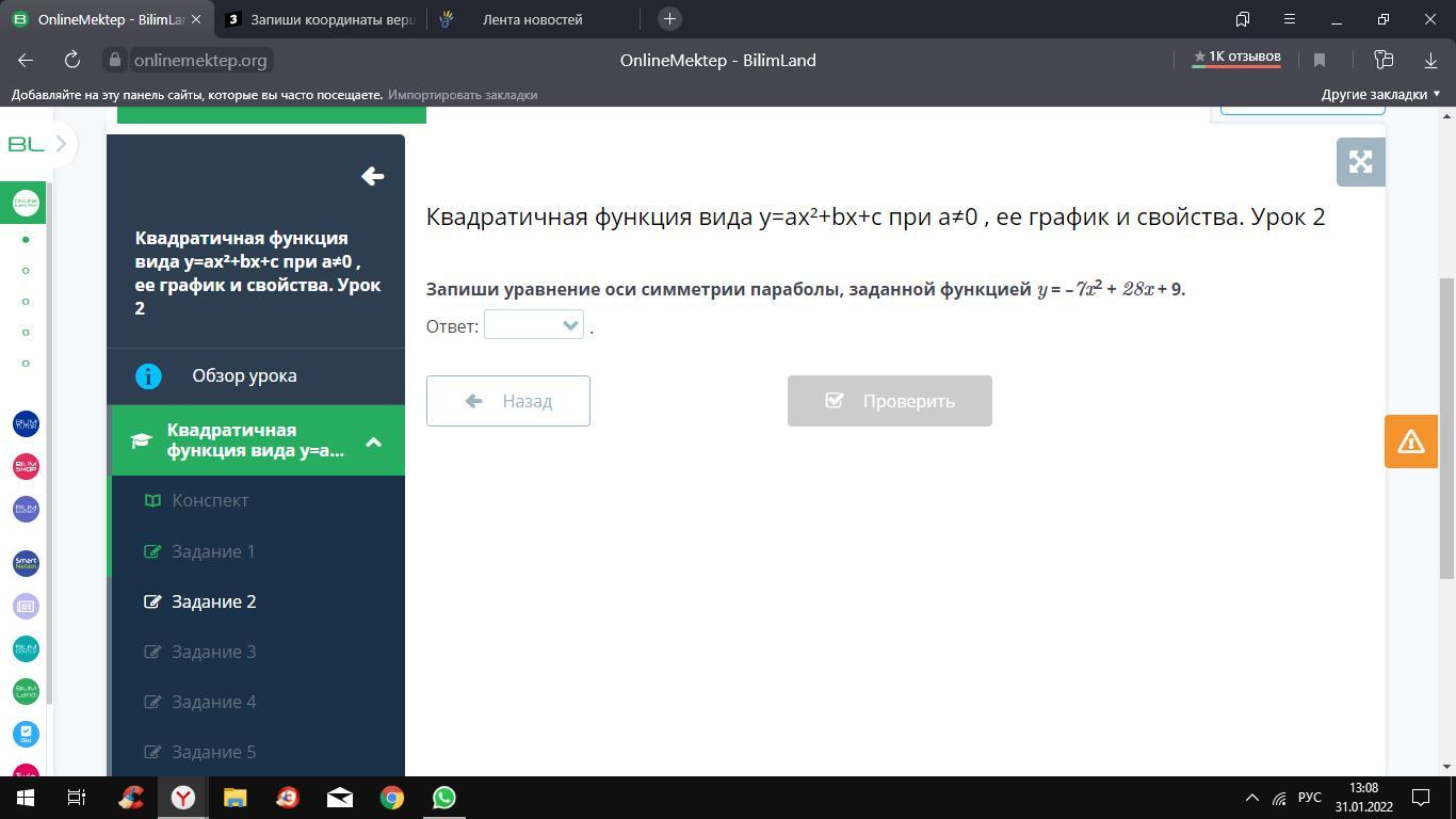Запиши уравнение оси симметрии параболы, заданной функцией y = –7x2 + 28x + 9.