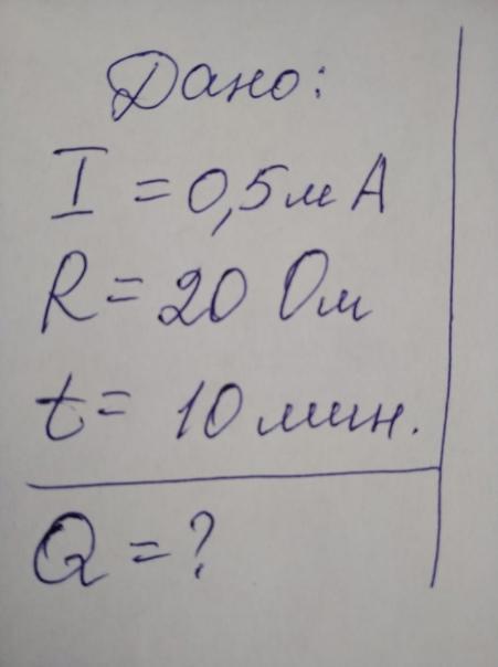 Q=0,0005 А*0,0005 А* 20 Ом*600с=0,003 Дж=3мДж