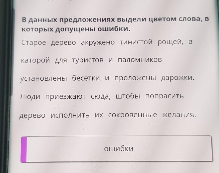 В данных предложениях выдели цветом слова, в которых допущены ошибки . Старое дерево акружено тинистой рощей, в каторой для туристов и паломников установлены бесетки и проложены дарожки. Люди приезжают сюда, штобы попрасить дерево Исполнить их сокровенные желания.