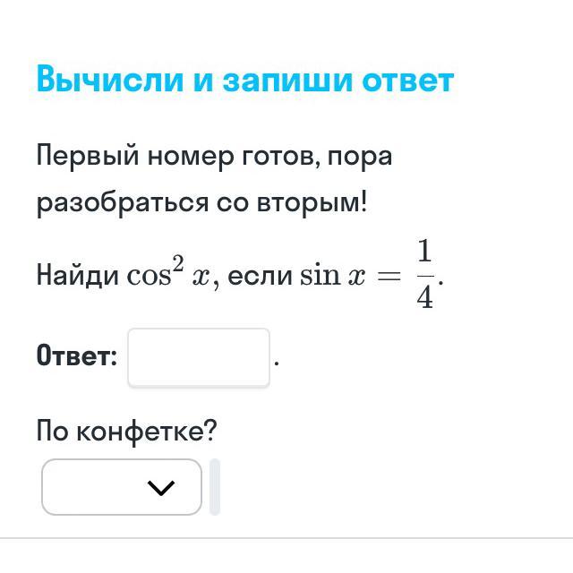 1/16+cos^2(x) = 1 отсюда cos^2(x)=15/16