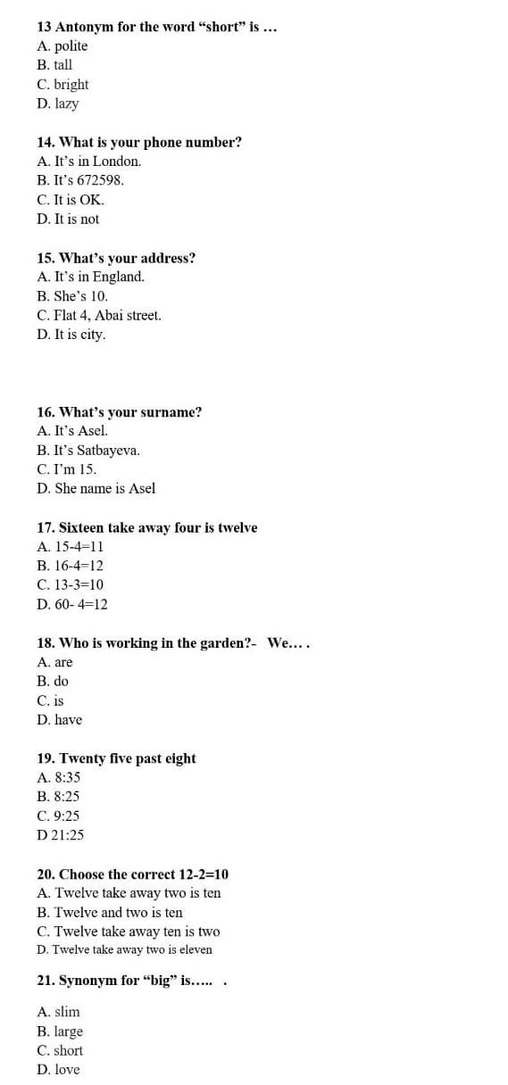 13 Antonym for the word "short" is ... A polite B tall C. bright D. lazy 14. What is your phone number? A. It's in London, B. It's 672598. C. It is OK D. It is not 15. What's your address? A. It's in England B. She's 10. C. Flat 4. Abai streel. D. It is city II 16. What's your surname? A. It's Asel B. It's Satbayeva. C. I'm 15. D. She name is Asel 17 Sixteen take away four is twelve A. 15-4-11 B. 16-4-12 C. 13-3=10 D 60-4=12 18. Wbo is working in the garden?- We.... A. are B. do C. is D. have 19. Twenty five past eight A 8:35 B. 8:25 C.9-25 D 21:25