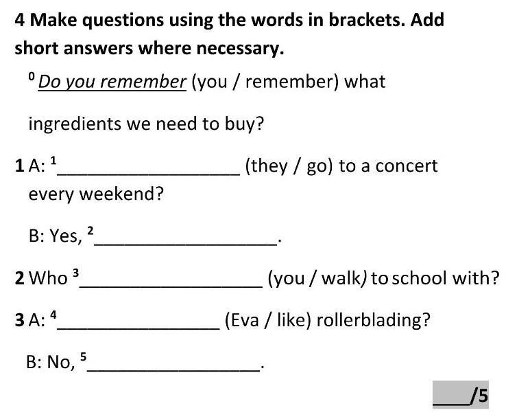 1. They go 2. You walk 3. Like Eva 4. No, 5. I like