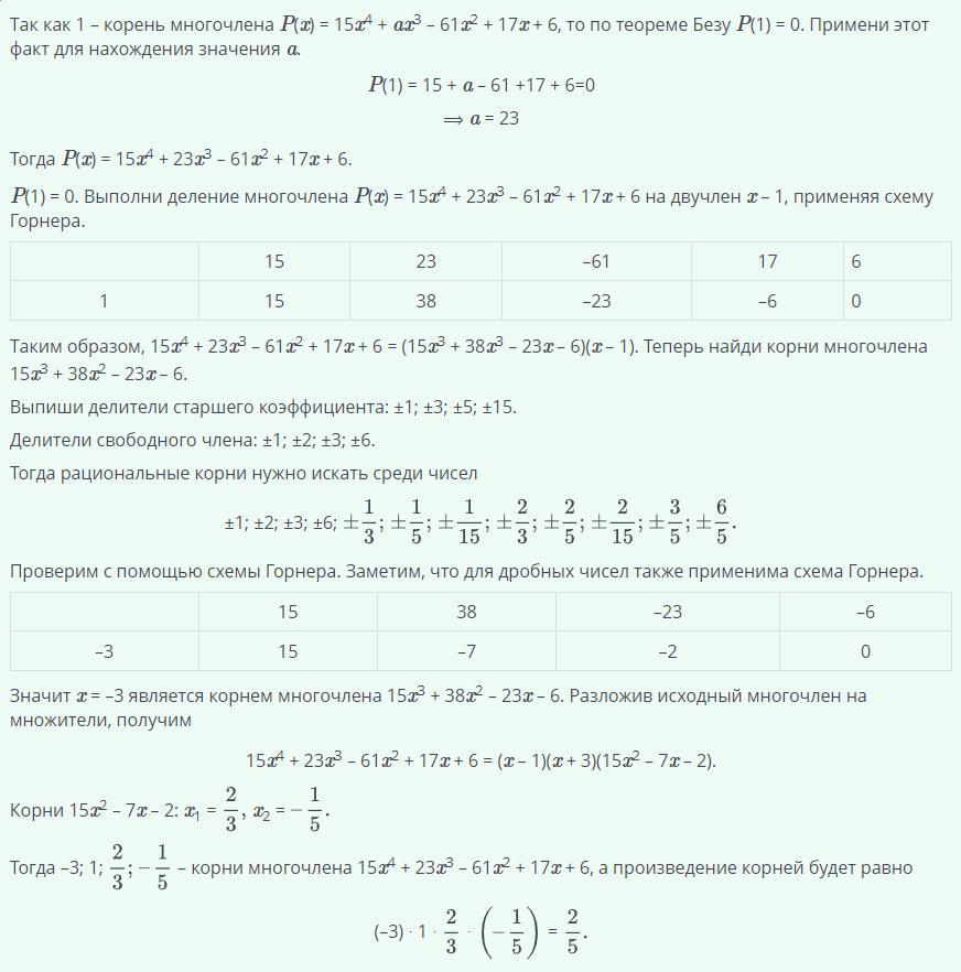 Найди произведение корней многочлена P(x) = 15x^4+ax^3-61x^2+17x+6 , если один из корней равен 1
