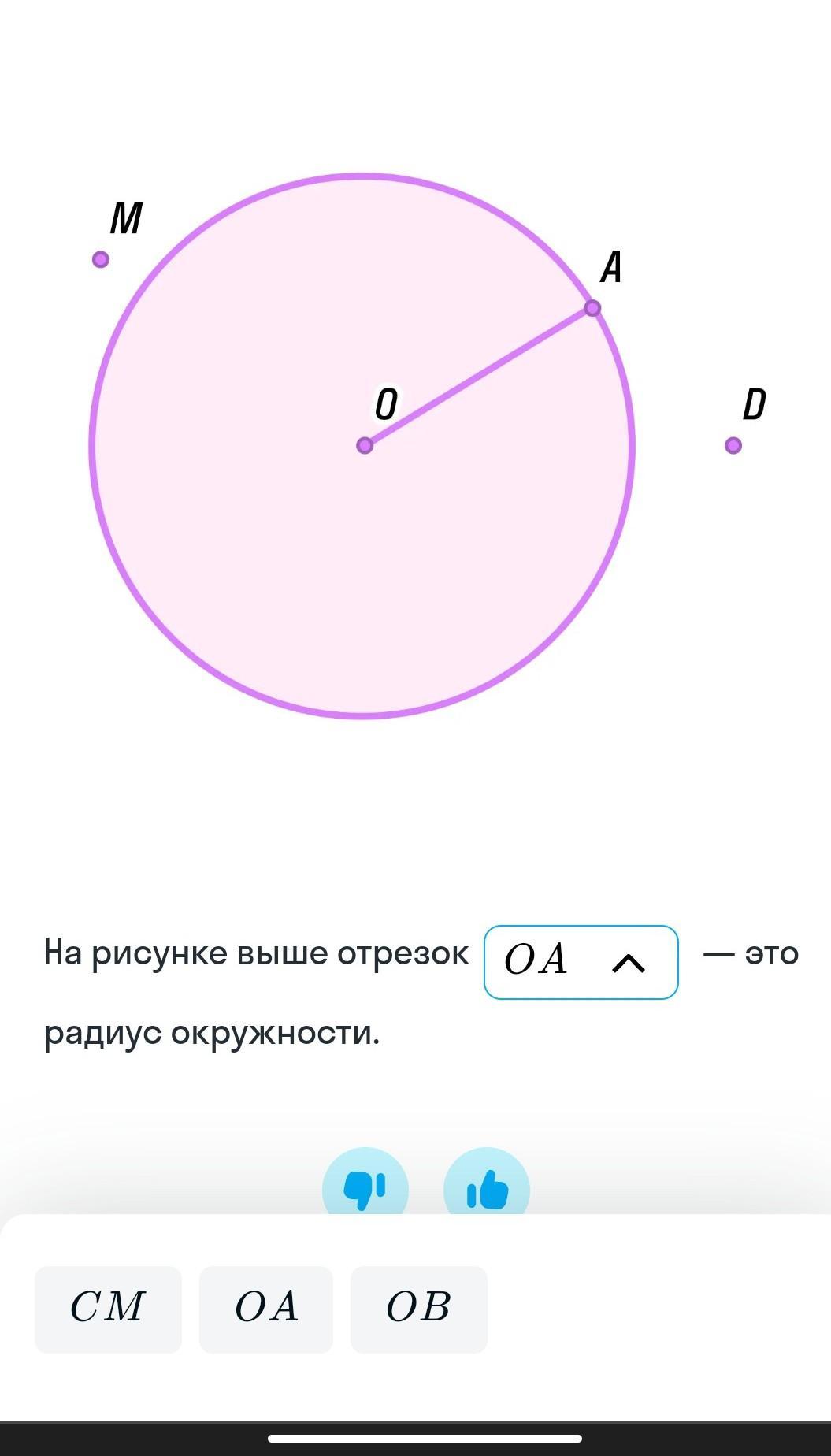 Радиус-это прямая линия, соединяющая центр окружности( точка О) с любой точкой окружности (здесь т. А)