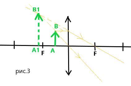 3 — промінь, який проходить через фокус F — після заломлення в лінзі йде паралельно головній оптичній осі лінзи.